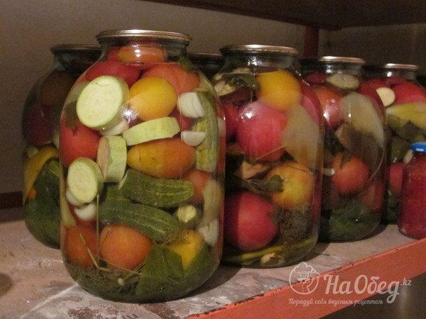Затем стерилизуем банки с овощами около десяти минут. После этого закатываем их и переворачиваем верх дном до полного охлаждения.