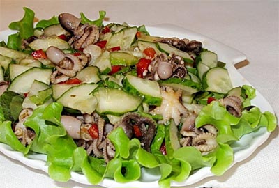 Калорийность осьминога составляет всего лишь 82 килокалории на 100 г. Это скромная цифра позволяет применять нежное филе в диетических и низкокалорийных салатах . Сегодня мы познакомим Вас с вкуснейшими салатами из осьминогов. Рецепты, конечно, не назовешь на скорую руку , потому что с осьминожками придется повозиться. В любом случае салаты из осьминогов сразу очаруют Вас своим вкусом и пользой.