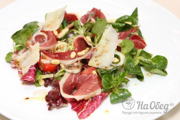 Затем взять сервировочную тарелку и красиво выложить на неё готовую вырезку телятины, потом помидоры и сбрызнуть второй половиной нашей заправки. После этого горкой сложить листья салата, также можно сбрызнуть заправкой.
