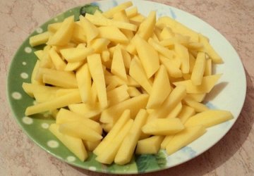 Первым делом стоит подготовить бульон из картофеля. Клубни очищаем, промываем и режем тонкими полосками (как на картофель фри).
