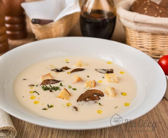 С картофеля слить в отдельную посуду половину отвара, положить овощно-грибную зажарку, посолить, поперчить и долить немного отвара. Томить 5 минут. Затем взбить немного блендером, ввести натертый на крупной терке плавленый сыр и на маленьком огне довести суп до однородной кремовой консистенции. Готовое блюдо посыпать перед подачей рубленой зеленью петрушки
