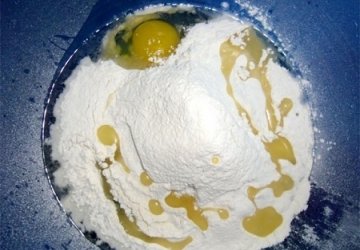 Для начала необходимо подготовить тесто: в небольшой миске смешиваем соль, яйцо, холодную воду. Всыпаем половину муки и аккуратно перемешиваем массу.
