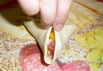Достаем из миски тесто и нарезаем его небольшими кусочками, размером со спичечный коробок. Затем аккуратно раскатываем каждый кусочек в лепешку и выкладываем на него начинку.