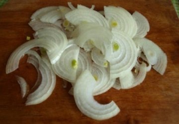 Сначала очищаем и режем луковицу. Будет лучше, если ее порезать полукольцами – так она будет выделяться из блюда и придавать ему дополнительную нотку вкуса. По желанию его можно обдать кипятком, чтобы удалить всю горечь.