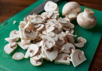 Затем режем грибы. Стоит отметить, что запеченные пельмени с грибами будут красивее и вкуснее, если их порезать ломтиками или дольками. По желанию шампиньон можно заменить на любые другие мягкие грибы.
