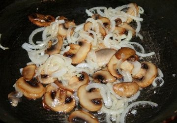 Наливаем в сковороду масло и обжариваем нарезку из грибов и лука до полуготовности. Делать это необходимо на слабом огне, так как лук быстро приобретает твердую коричневую корочку.