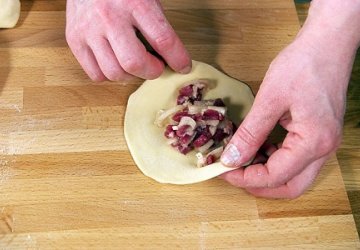 Раскатываем каждый кусочек при помощи скалки в тонкую лепешку. Толщина теста должна быть не более 5 мм. В середину круга кладем немного начинки и аккуратно залепляем противоположные концы. В результате у вас должен получиться квадрат. Берем 2 уголка и скрепляем вместе по центру. Проделываем данную операцию с остальными углами.