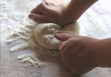 Теперь медленно вводим в массу муку и замешиваем тесто (предварительно муку следует просеять). Тесто необходимо не просто вымесить, а хорошенько размять руками, чтобы оно получилось эластичным и мягким. В среднем на этом уходит 15 минут. При выполнении замеса не стоит пользоваться миксером и прочими приспособлениями, так как они могут нарушить консистенцию готового продукта.