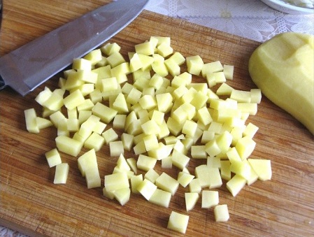 Картошку чистим, промываем и тоже нарезаем кубиками.