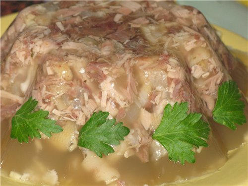 Перед подачей, окунаем ложку в горячую воду и, отряхнув, снимаем ею жир с холодца.