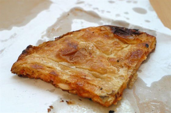 Лаваш обильно сбрызгиваем прохладной водой и укладываем на горячую сковороду, смазанную маслом таким образом, чтобы его поля свисали за бортики.