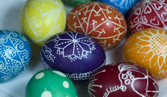 Смешиваем в 3 мисочках по 1 ложке охлажденного желатина, 2 ложки сока-красителя, 1 ст. л. майонеза. В эту смесь окунаем холодные яйца, поливаем их остатками. «Крашанки» помещаем на тарелку, застеленную пищевой пленкой и снова прячем в холодильник.